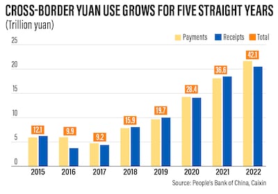 In 2022, 42.1 trillion yuan ($6.1 trillion) worth of the country’s cross-border payments and receipts were settled in the Chinese currency, up 15 per cent from the previous year, marking the fifth straight annual increase, Chinese news website Caixin global said, citing a People’s Bank of China February report.