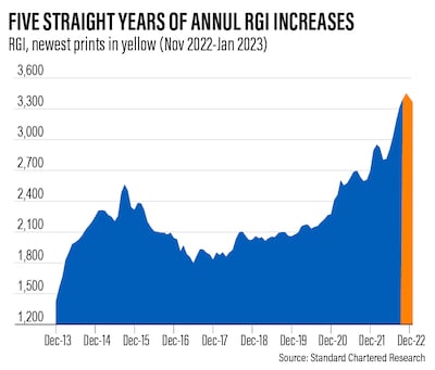 Although the RGI fell for two straight months to 3,366 in January, it had risen for seven consecutive months to a record-high of 3,452 in November.