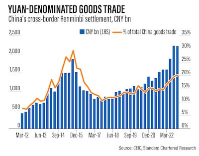 “We, however, continue to take comfort from the fact that renminbi-settled goods trade stayed high as a share of total China goods trade, at 20.1 per cent in Q4-2022 versus 19.7 per cent in Q3, maintaining its gain from H1’s 17.6 per cent average,” Standard Chartered economists said.
