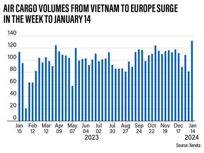 Air cargo volumes from Vietnam to Europe – a major trade route for clothing exports – rose 62 per cent in the week ending January 14 and air freight rates increased by 10 per cent compared to the previous week, freight platform Xeneta said in its latest report.