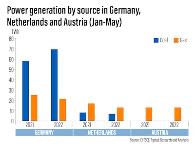 For the first five months of 2022, total coal-fired power generation in Germany rose to 70 terawatt hours, an increase of 20 per cent or 11.3 terawatt hours, while power from gas dropped 16 per cent to four terawatt hours, compared with the same period last year, Rystad Energy said.