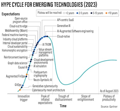US research firm Gartner has termed generative artificial intelligence as overhyped and positioned it at the peak of “inflated expectations” for emerging technology in 2023, close behind AI-augmented software engineering and cloud-native technology.