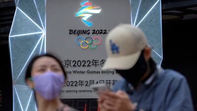 People wearing face masks to protect against Covid-19 walk past a display showing a countdown clock to the Beijing 2022 Winter Olympics in China. AP