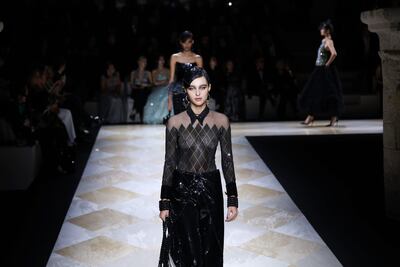 The Dubai show was held at the foot of the Burj Khalifa in 2021, with the Dubai Fountains providing a suitably dramatic backdrop. The event coincided with the 10-year anniversary of the Armani Hotel Dubai and was a manifestation of the designer’s close ties with the emirate.