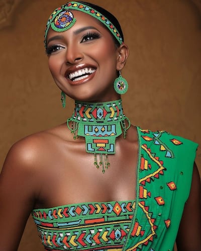 During this year's national costume round, Govender sported a new take on a sari with Zulu beading and traditional tribal patterns, effectively fusing Indian and African motifs.