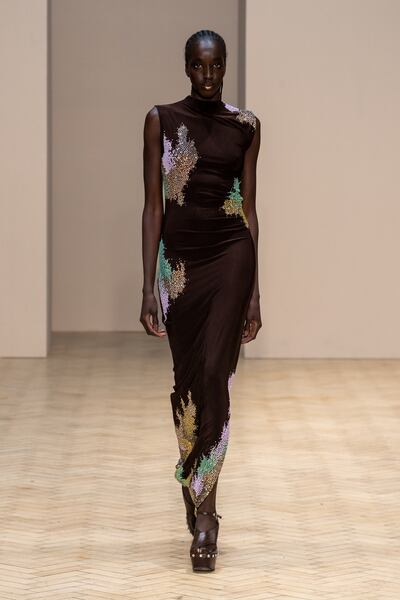 London resident New Yorker Michael Halpern was brought up on old Hollywood movies and glamour is deep in his design DNA. Accordingly, the red-carpet dresses on the catwalk were inspired by Cecil B DeMille extravaganzas, with slipper satin draperies, giant-ruffle-trimmed dresses of gold and emerald jacquard, and a series of jumpsuits and dresses with colourful block fringing that mesmerisingly swished with every movement. Some will surely be destined for the Oscars next month, and a few months further on, those fringes could be swishing into many a wardrobe.