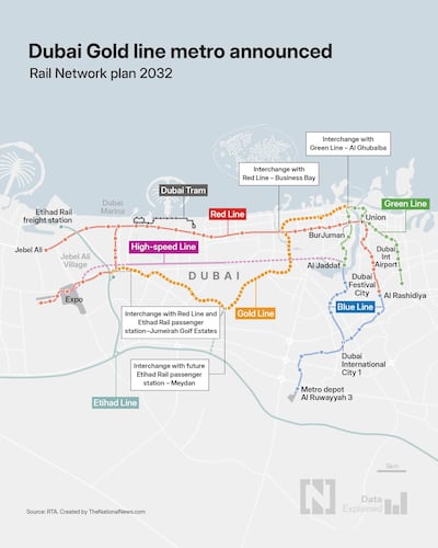 The new line, which will link to 55 development projects, will have 18 stations at locations including Al Ghubaiba, Business Bay, Nad Al Sheba, Al Barsha South and Jumeirah Village Circle before ending at Jumeirah Golf Estates, where it will connect with Etihad Rail. There will also be connections to the Red Line and the Green Line.