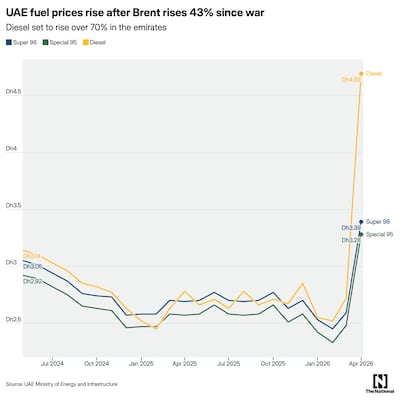 The month-on-month rise in UAE diesel prices in April, from Dh2.72 to Dh4.69 per litre, was the steepest single-month fuel price increase recorded since the UAE adopted monthly benchmark-linked pricing.