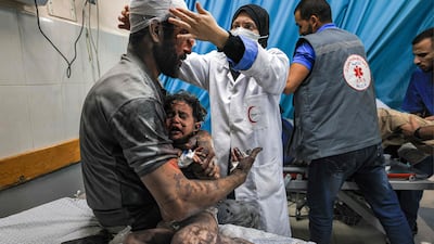 A wounded Palestinian is taken into Al Shifa hospital after Israeli air strikes on Gaza City. AP -