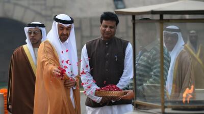 Sheikh Mohammed bin Zayed, Crown Prince of Abu Dhabi and Deputy Supreme Commander of the Armed Forces, pays a tribute at Rajghat, the memorial for Mahatma Gandhi in New Delhi on Wednesday. Prakash Singh / AFP -