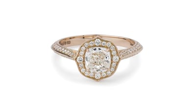 The Deco Engagement Ring, from British celebrity jewellery Stephen Webster, is set in 18-carat Fairtrade rose gold with a one-carat diamond and 0.65 carats of pavé diamonds. Webster, who travelled to Peru to witness first-hand the positive difference Fairtrade mining was making, exclusively uses ethically mined and sourced gold in his Bridal Collection.