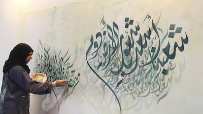 See the exhibition Beautiful World, in which Zayed University student Narjes Noureddine showcases a calligraphy painting created in response to the poem Beautiful World, written by Sheikh Zayed, the founding President of the UAE. Pictured: Narjes Noureddine creating a painting for Beautiful World.