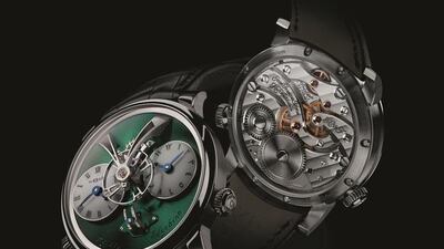 Last month, the niche watchmaking brand MB&F gave its award-winning Legacy Machine No 1 timepiece a Middle Eastern spin, with the launch of the Legacy Machine No 1 MAD Dubai edition, which has Arabic numerals on its “home-time” sub dial. Part of a limited collection of just 13 pieces, the watch stands out for two more reasons – it is the first Legacy Machine available in grade 5 titanium, an aerospace-grade alloy known for its lightness, strength and resistance to corrosion, and it has a vivid green-CVD-treated movement main plate, a material that has only recently become usable. The 3-D horological movement with bridge design was developed by Swiss shaper Chronode, and its finishing was specified by independent Finnish watchmaker Kari Voutilainen. Other features include a black hand-stitched alligator strap and gold chatons. Available exclusively through the MB&F MAD Gallery in Dubai for Dh308,100, the watch is a symbol of friendship between