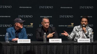 Irrfan Khan and Tom Hanks are in Singapore to promote their upcoming film Inferno. Khan took to Twitter to share a photograph of himself with the film's director Ron Howard and Hanks. "Reunited for Inferno the movie promotions with these amazing guys Ron Howard, Tom Hanks in Singapore!" he tweeted yesterday. It is the third in a series of films named after and adapted from books by Dan Brown, including Angels and Demons (2009), and The Da Vinci Code (2006). Inferno is based on Brown's 2013 novel, and sees Hanks reprising the role of Robert Langdon, a professor of symbology at Harvard University. Khan portrays Harry "The Provost" Sims, head of a secretive organisation. Inferno, which also stars Felicity Jones and Omar Sy, is scheduled to be released on October 28. – IANS