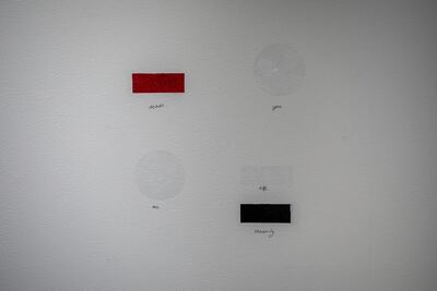 In Dynamics of Motion, the artist reflects on fading cultural customs in the face of consumerism through fabric collage. Al Banna ripped apart traditional fabrics worn by Emirati women and arranged them in a circular piece that is textured with beads, crystals and mirrors.