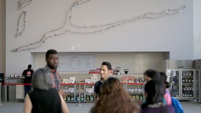 This amusing and evocative piece by Iranian-British artist Farhad Moshiri employs kitchen knives and sharp objects of all shapes, sizes and colours stuck in a wall to spell “shukran”. Moshiri, who is known within the neb-pop movement for the simplicity of his compositions, uses everyday materials and ironically juxtaposes them with Swarovski crystals. The installation went up at Manarat Al Saadiyat during the recently concluded Abu Dhabi Art, and will remain on public display at the venue for six months.