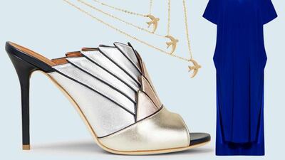 Fill the V-neck of a bold kaftan with a layered necklace and accessorise with statement metallic mules.