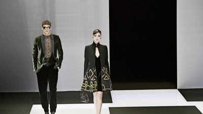 Designers in London and New York are planning to combine their men’s and womenswear collections on one catwalk next season. Armani demonstrated how well this could work with a series of male chaperones shadowing his ladies down the catwalk, wearing the same digital motifs on sweaters.