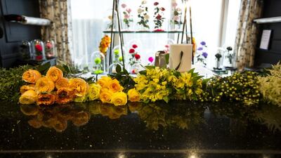 Lay out all of the flowers that will be included in your bouquet. For this arrangement, Jerome Yu, a senior florist at Forever Rose, opted for a summery bouquet consisting of Yellow Deja Vu and peach-coloured Sweet Expression roses, surrounded by white Astilbe, white Hypericum and Alstroemeria.