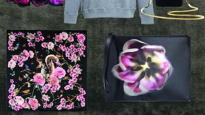 1. Tote, Dh325, Ted Baker, World Trade Center Mall, 02 628 2890; Dubai Mall, 04 434 0623 and elsewhere. 2. Dress, Dh900, Jigsaw, Dubai Mall, 04 339 8644. 3. Floral minaudière, Dh10,245, Lanvin, Avenue at Etihad Towers, 02 679 6160; Dubai Mall, 04 330 8008 and elsewhere. 4. Sweatshirt, Dh3,700, Jason Wu at www.brownsfashion.com. 5. Lily clutch, Dh2,130, Christopher Kane at www.brownsfashion.com. 6. Scarf, Dh1,940, Dolce & Gabbana, The Galleria, 02 674 3711; BurJuman, 04 501 2880. 7. Floral headband, Dh59, H&M, Marina Mall, 02 681 7871; Dubai Mall, 04 330 8327 and elsewhere. 8. Heels, Dh348, Asos, www.asos.com. 9. Pleated top, Dh180, Topshop, Marina Mall, 02 681 8246; Dubai Mall, 04 339 9802 and elsewhere. 10. Mohair slate rug (backdrop), Dh4,770 per square metre, The Rug Company, DIFC, 04 323 1161.