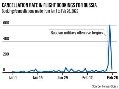Another industry that has seen an impact is travel. The conflict prompted an instant spike in flight cancellations to and from Russia, according to data from travel trends firm ForwardKeys. On February 25, the day after the start of the military offensive in Ukraine, every booking that was made for travel to Russia was outweighed by six cancellations of pre-existing bookings.