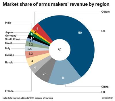The US remained the world's top country for arms manufacturing, with 41 companies from the world's biggest economy combining to post $317 billion in revenue last year, which is a 2.5 per cent year-on-year increase, Sipri said. Industry major Lockheed Martin remained No 1, despite its revenue dropping 1.6 per cent – a third consecutive annual decline – to $60.8 billion.