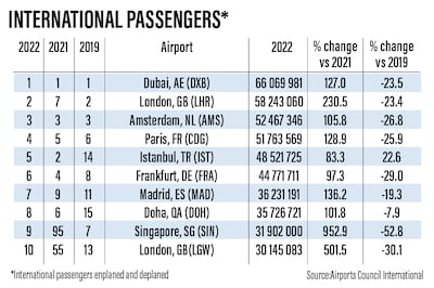 London, Amsterdam, Paris and Istanbul followed Dubai as the top-five busiest hubs by international air traffic, the trade association for airports — representing nearly 2,000 airports worldwide — said on Wednesday.