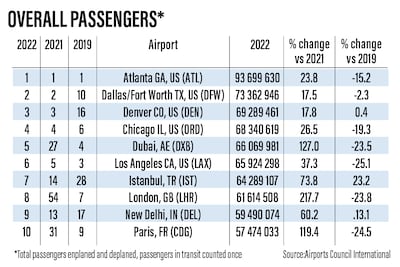 Hartsfield-Jackson Atlanta International Airport once again topped the rankings by overall passenger traffic last year, returning to the list with a 23.8 per cent year-on-year increase to 93.7 million travellers, ACI data showed.