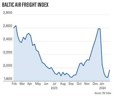 The Baltic Exchange Air Freight Index, which shows weekly transactional rates for general cargo as provided by freight forwarders, increased 6.4 per cent in the week ending January 29 to $1,972, according to price calculating agency TAC Index. The rise comes after successive declines, since a peak in the middle of last month.