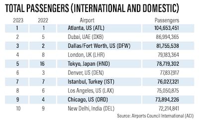 It was followed by Dubai for the first time, ACI data showing that DXB overtook Dallas/Fort Worth in 2023. DXB's was fifth in 2022 and fourth in 2019 before the Covid pandemic, underscoring the emirate's focus on further expanding its aviation sector.