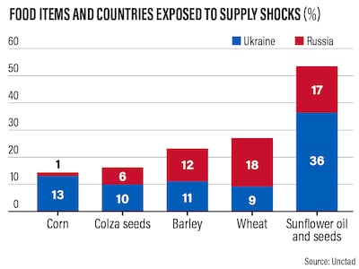 On average, more than 5 per cent of the world's poorest countries’ import basket is composed of products that whose prices are expected to increase due to the Russia-Ukraine war, Unctad calculations showed. The share is below 1 per cent for richer countries.