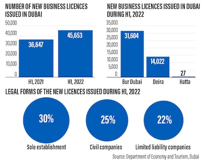 Dubai issued 45,653 new business licences in the first half of 2022, an annual jump of almost 25 per cent, reflecting strong business sentiment and robust growth in the post-Covid era, the Dubai Media Office said on Tuesday.