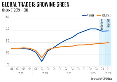 Green goods trade grew by about 4 per cent in the second half of the year. Their combined value hit a record $1.9 trillion in 2022, up more than $100 billion compared to 2021.
