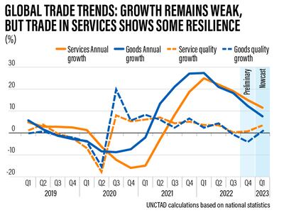 Global trade in goods during the first three months of this year is forecast to increase by about 1 per cent, while trade in services is expected to increase by about 3 per cent, from the fourth quarter of 2022, according to the report.