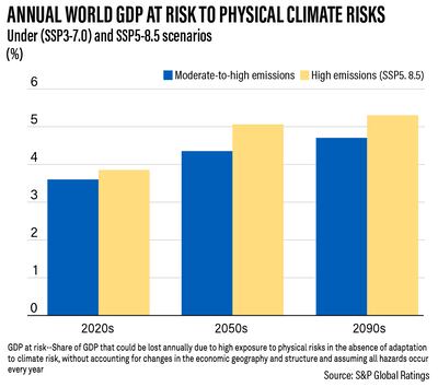 The rating agency estimated that 3.2 per cent of global GDP is at risk annually under SSP1-2.6 and this could rise to 5.1 per cent under SSP5-8.5, where emissions are high under limited mitigation.