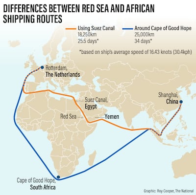 Major shipping players are opting to avoid the Suez Canal and taking an alternative route via the Cape of Good Hope in South Africa, which adds more than two weeks to the journey.