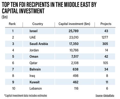 In the Middle East region, the Emirates continued to maintain a leading position with the number of FDI projects, and was ranked second in capital investment flows after Israel, which attracted $25 billion worth of investment from Intel for a chip plant in the country last year.