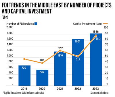 The total FDI in the Middle East grew in 2023, according to the latest GlobalData report. Project numbers rose 11.9 per cent annually to 1,848, while inbound capital investment surged 70.8 per cent to $88.3 billion.