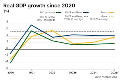 The increase is driven by the Gulf region, where growth is projected to rise to 1.9 per cent this year from 0.5 per cent in 2023, the lender said in its Mena Economic Update. In the rest of the region, “growth is expected to decelerate”, with oil importers' growth forecast to slow to 2.1 per cent this year from 3.2 per cent in 2023, and for non-GCC oil exporters, to 2.7 per cent from 3.2 per cent.