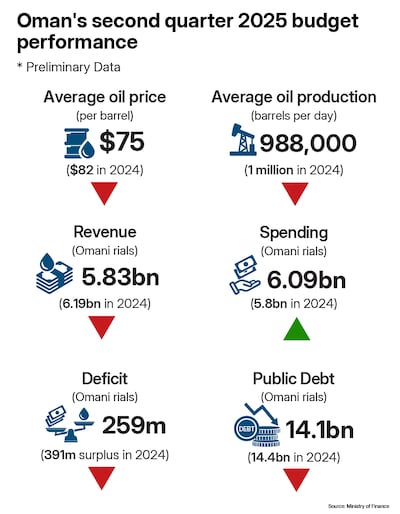 Revenue in three months to the end of June fell 6 per cent on an annual basis to 5.8 billion rials as oil prices traded $75 per barrel on an average compared to $82 per barrel in the same quarter of 2024, according to preliminary data from Oman’s Ministry of Finance.