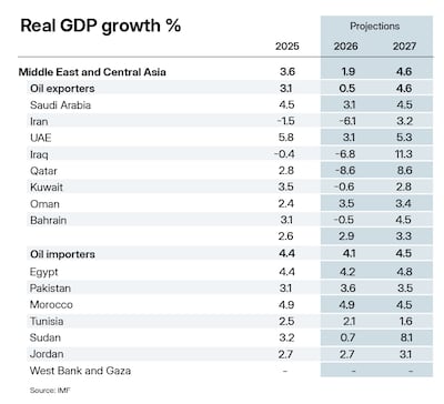 Economies with badly damaged infrastructure and less access to alternatives to export routes, such as Bahrain, Iran, Iraq, Kuwait and Qatar, are forecast to contract in 2026. The IMF estimates Qatar's economy will shrink by 8.6 per cent this year, before swinging to the same level of growth in 2027. Bahrain and Kuwait's economies are projected to contract by 0.5 per cent and 0.6 per cent before rebounding by 4.5 per cent and 2.8 per cent, respectively, next year.