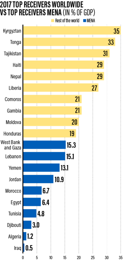 The Middle East and North Africa saw the second biggest gain in remittances regionally speaking, with money sent back home increasing 9.3 per cent to $53bn in 2017. The biggest bulk of that money, $20bn, came from Egyptians where the steep devaluation of the Egyptian pound against the US dollar in November 2016 spurred Egyptians living abroad to pour back money into the country. Many had previously held back from doing so before the devaluation because the central bank of Egypt was using its foreign reserves to keep the pound’s value artificially high.