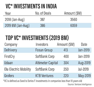 Figures from Venture Intelligence, a Chennai start-up data analysis firm, show that despite the difficult economic backdrop, a record $6bn of venture capital was invested in Indian start-ups in the first eight months of 2019, up from $3.5bn during the same period a year ago.