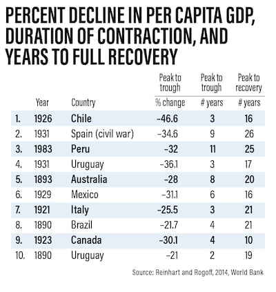 The economy shrunk by 20.3 per cent last year, after a 6.7 per cent contraction the year before, according to the lender.