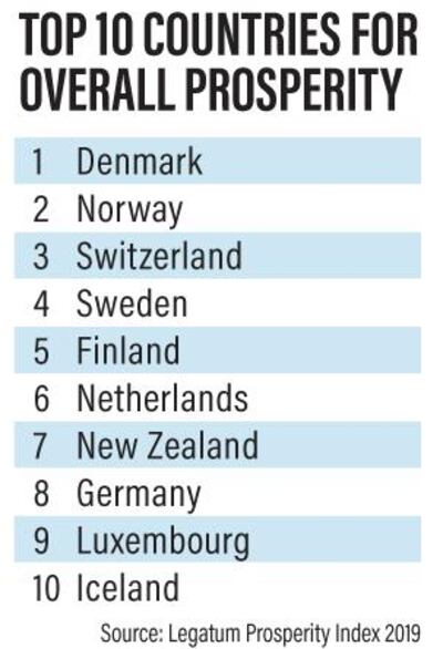 Denmark topped this year's prosperity index, ranking in the top 10 for every pillar and for having the best living conditions. The top 10 countries for overall prosperity were nearly all in Europe, including number two Norway, which topped last year's index, as well as Switzerland, Sweden, Finland, the Netherlands, Germany, Luxembourg and Iceland. New Zealand, which took seventh position, was the only exception.