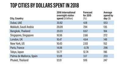 When looking at the cities by number of dollars spent in 2018, Dubai topped the list for the fourth year in a row with a total spend of $30.82 billion, while Makkah took the No 2 spot for the second consecutive year with $20.09bn and Bangkok came in third, Mastercard’s Global Destination Cities Index 2019 found.