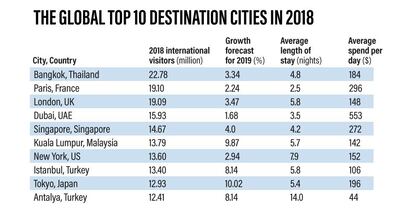 Meanwhile, the UAE capital Abu Dhabi was ranked as the fastest growing city in the Middle East and Africa, with a compound annual growth rate of 16.7 per cent between 2009 and 2018 in overnight arrivals.