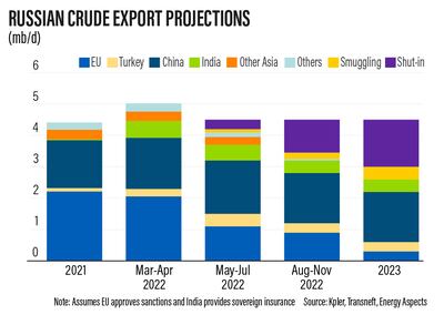 Europe currently receives 2 million bpd of Russian crude, the Energy Aspects report said, and under its sanctions package, the EU plans to halt imports of crude within six months and products within eight.
