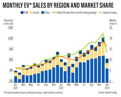 China, the world's biggest EV market, posted flat sales in January on a monthly basis, but this was an almost 50 per cent slide from a year ago.