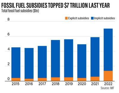 Fossil-fuel subsidies surged to a record $7 trillion last year amid a surge in global energy prices following Russia’s invasion of Ukraine and as the global economy rebounded after the Covid-19 pandemic.